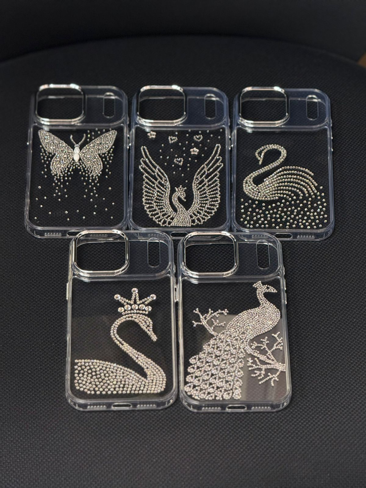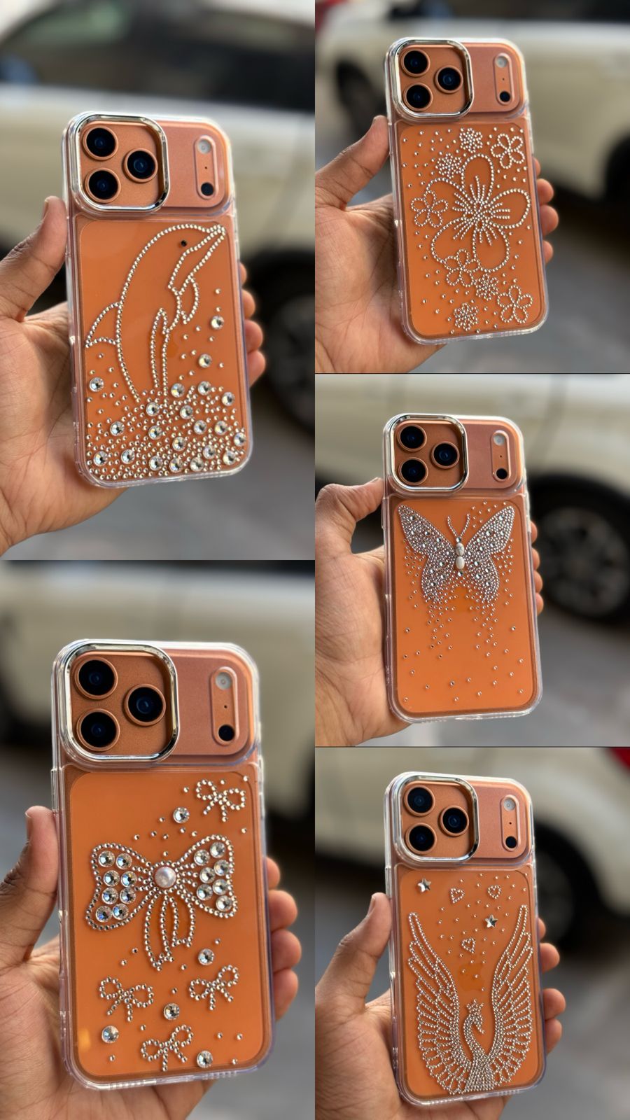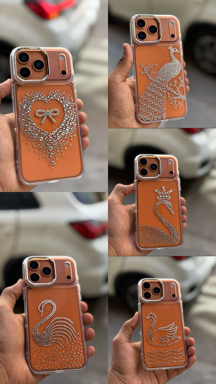 The Silicon Stone Case is built for style-conscious women who refuse to compromise on protection. Featuring a soft peach silicon body, clear outer shell, sliding camera cover, and hand-placed silver rhinestone designs—this case is a statement piece, not just a cover.